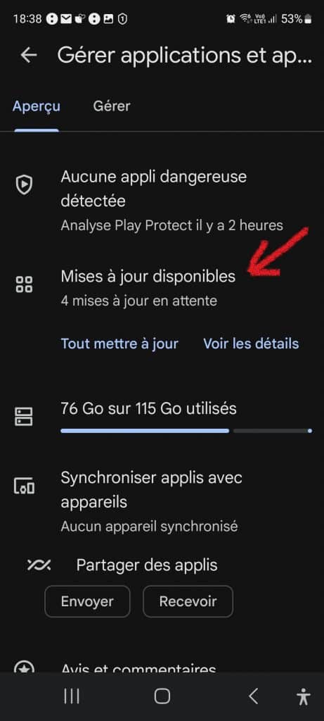 Pour mettre à jour vos applications, ouvrez le Play Store (fig.1) et appuyez sur l’icône de votre profil (fig.2) en haut à droite. Sélectionnez « Gérer les applications et l’appareil » (fig.3), puis « Mises à jour disponibles » (fig.4).
