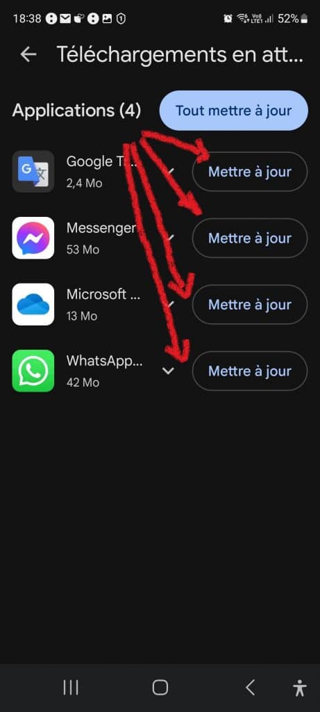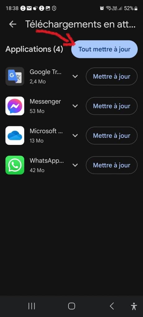 Vous pouvez choisir de mettre à jour chaque application individuellement (fig.5) ou toutes en même temps en appuyant sur « Tout mettre à jour » (fig.6). Et vous pourrez ensuite vérifier en revenant sur la page précédentes que toutes les applications sont bien à jour (fig.7).
